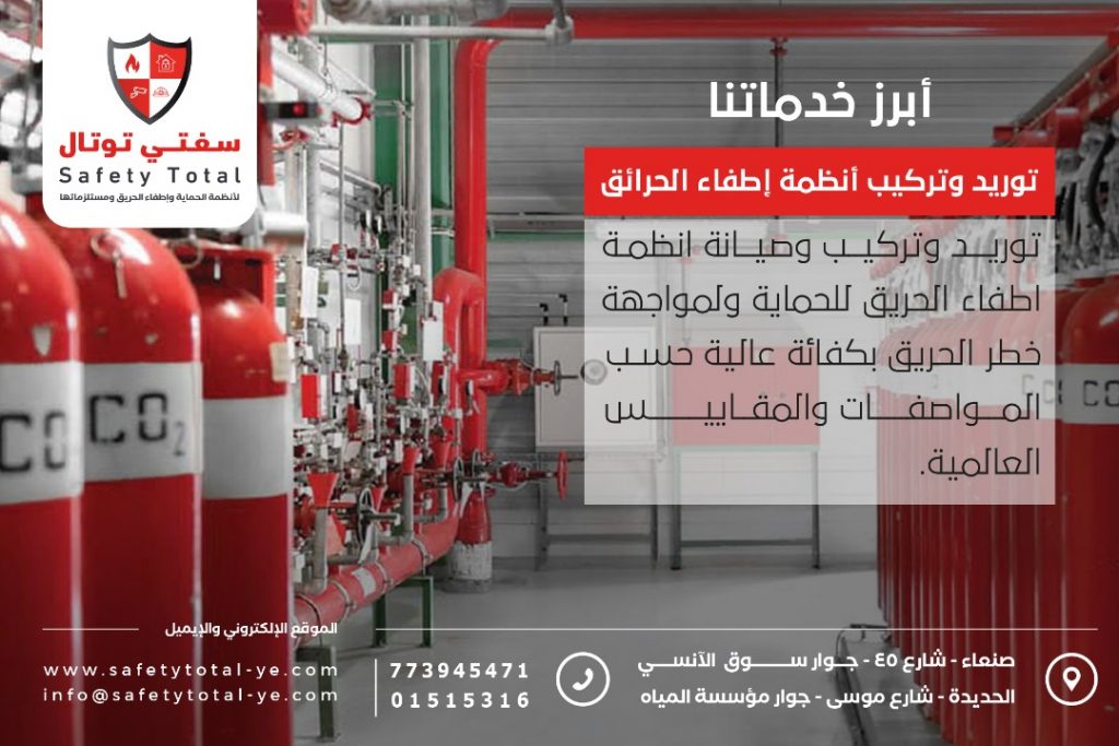 تقــدم لكــم شــركة سفتي توتال لأنظمــة الأمــن والســلامة ومعدات مكافحة الحريق اليمن مجموعــة واســعة مــن خيــارات أنظمــة مكافحــة الحريــق، ســواء كانــت الأنظمــة الرطبــة أو الأنظمــة الجافــة أو أنظمــة الاطفــاء بالضبــاب أو أنظمــة الاطفــاء بالغــازات أو الأنظمــة الرغويــة نحــن نعمــل معكــم لإيجــاد النظــام الــذي يناســب احتياجكــم وذلــك وفقــا للمعاييــر الدوليــة كمــا نؤمــن درجــات الســلامة القصــوى لمبانيكــم ومصالحكــم الخاصــة والعامة .