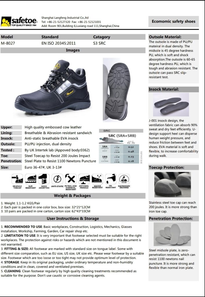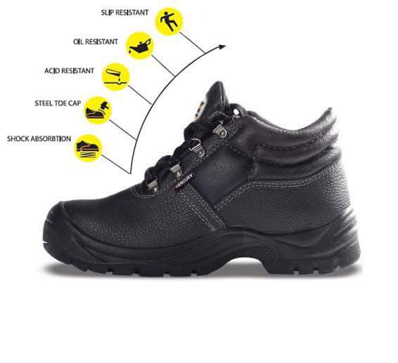 1• الأحذية المصنوعة من الجلد الطبيعى أو الصناعى المقوى بمقدمة فولاذية تستخدم لحماية القدم من سقوط المواد عليها ويصمم النعل بحيث يحتوى على طبقة فولاذية للوقاية عند السير على الأجزاء الحادة والواخزة من وصول هذه الأجزاء للقدم ويستخدمها العاملون بورش الحدادة والنجارة وتشكيل المعادن.